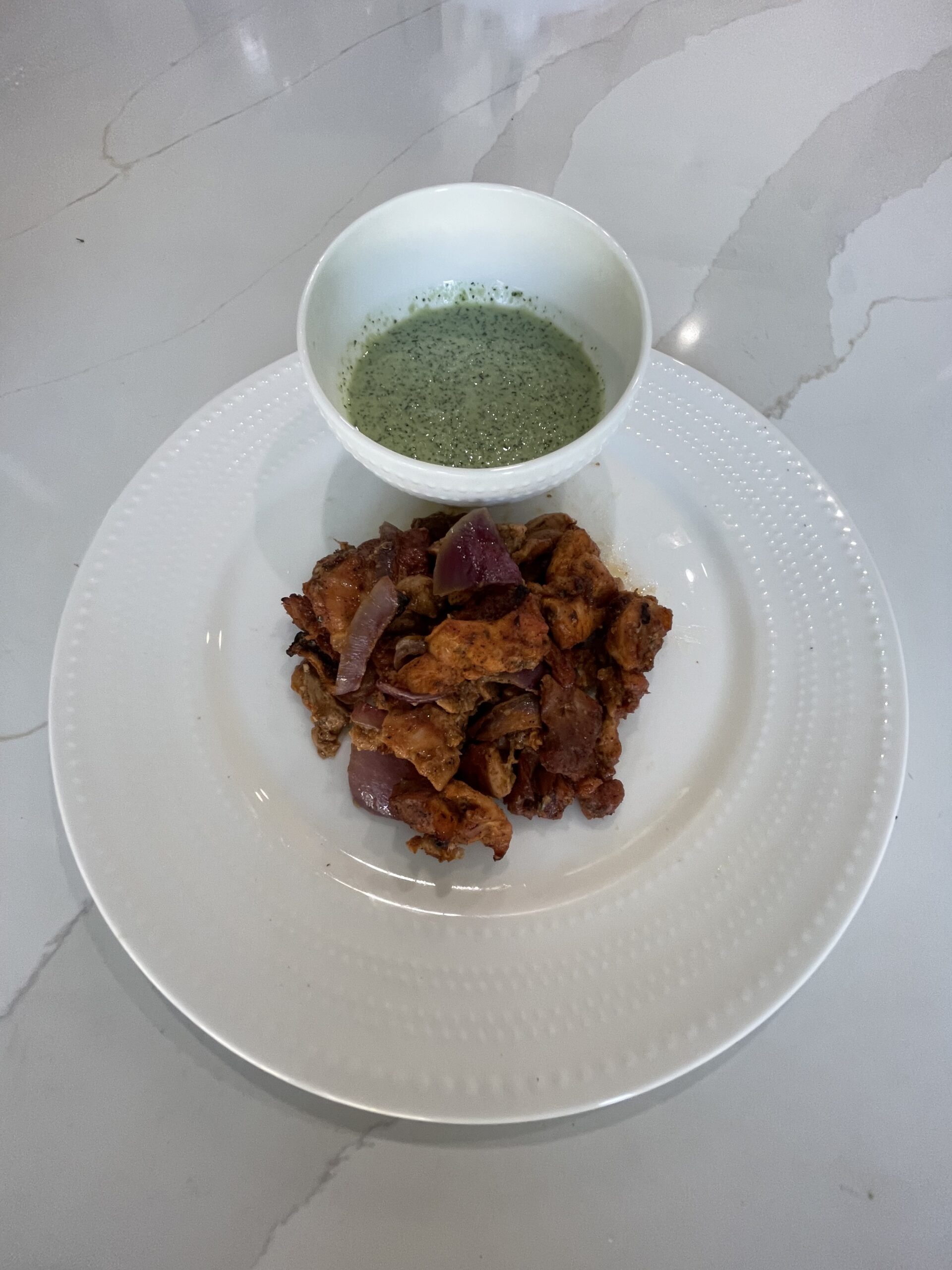 Mix really well & marinate in the fridge for atleast 2 hrs. *It still tastes great without letting it marinate but the longer you let it sit the better it tastes. When you’re ready to cook it, bring chicken to room temp for 30 mins and preheat oven to 450°F Line a sheet pan with parchment paper, and add the chicken. Cut 2 red onions into small wedges or slices and place on the chicken. Place in the oven at 400°F for 25-35 mins. Or until golden brown and cooked to 165°.